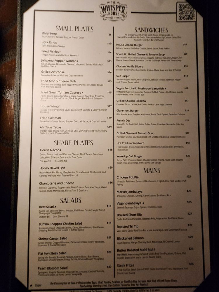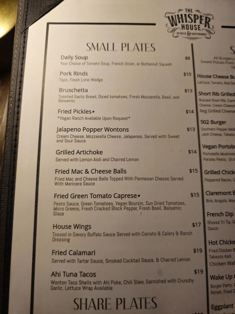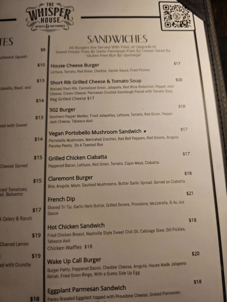 Introducing The Whisper House, a trendy cocktail bar and restaurant in Claremont, CA. This New American and burger joint offers a diverse menu with vegan and vegetarian options. The ambiance is hipster and casual, perfect for a night out with friends or family. With amenities like outdoor seating, a full bar, and happy hour specials, The Whisper House caters to a variety of preferences. The location is accessible and offers various parking options. The menu boasts a range of dishes suitable for brunch, lunch, dinner, and even late-night bites. From the attentive waiter service to the covered outdoor seating and private dining options, The Whisper House provides an all-encompassing dining experience. Explore their offerings, from delicious burgers to unique cocktails, and enjoy a memorable meal at this vibrant establishment.